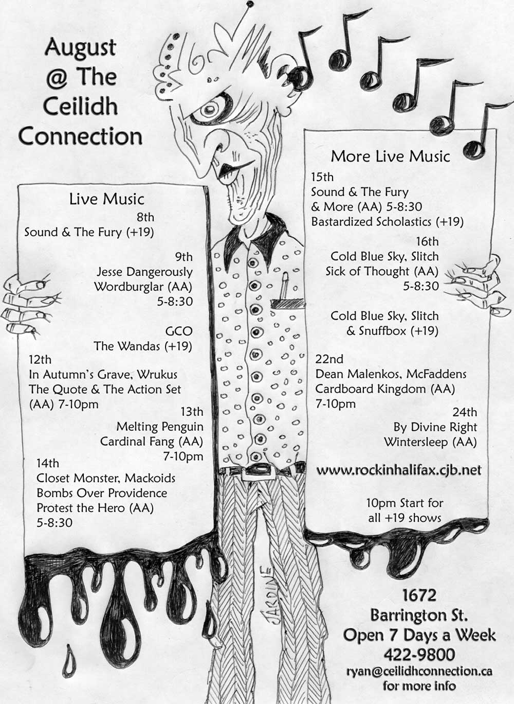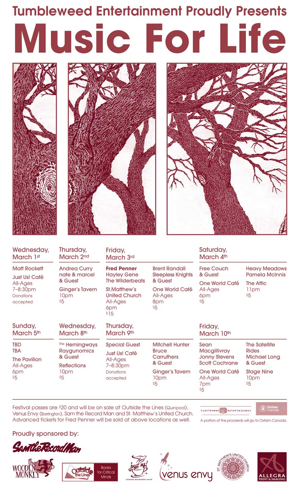 Although my time is now focused mainly on T.O.F.U., I oversaw a wide variety of events while operating my record label, Tumbleweed Entertainment. Originally based in Halifax, Nova Scotia, Canada, the company was involved in venue management for the Ceilidh Connection during its operation as both an all-ages and licensed establishment, artist management for numerous solo acts and bands, and event production for both local and touring acts.